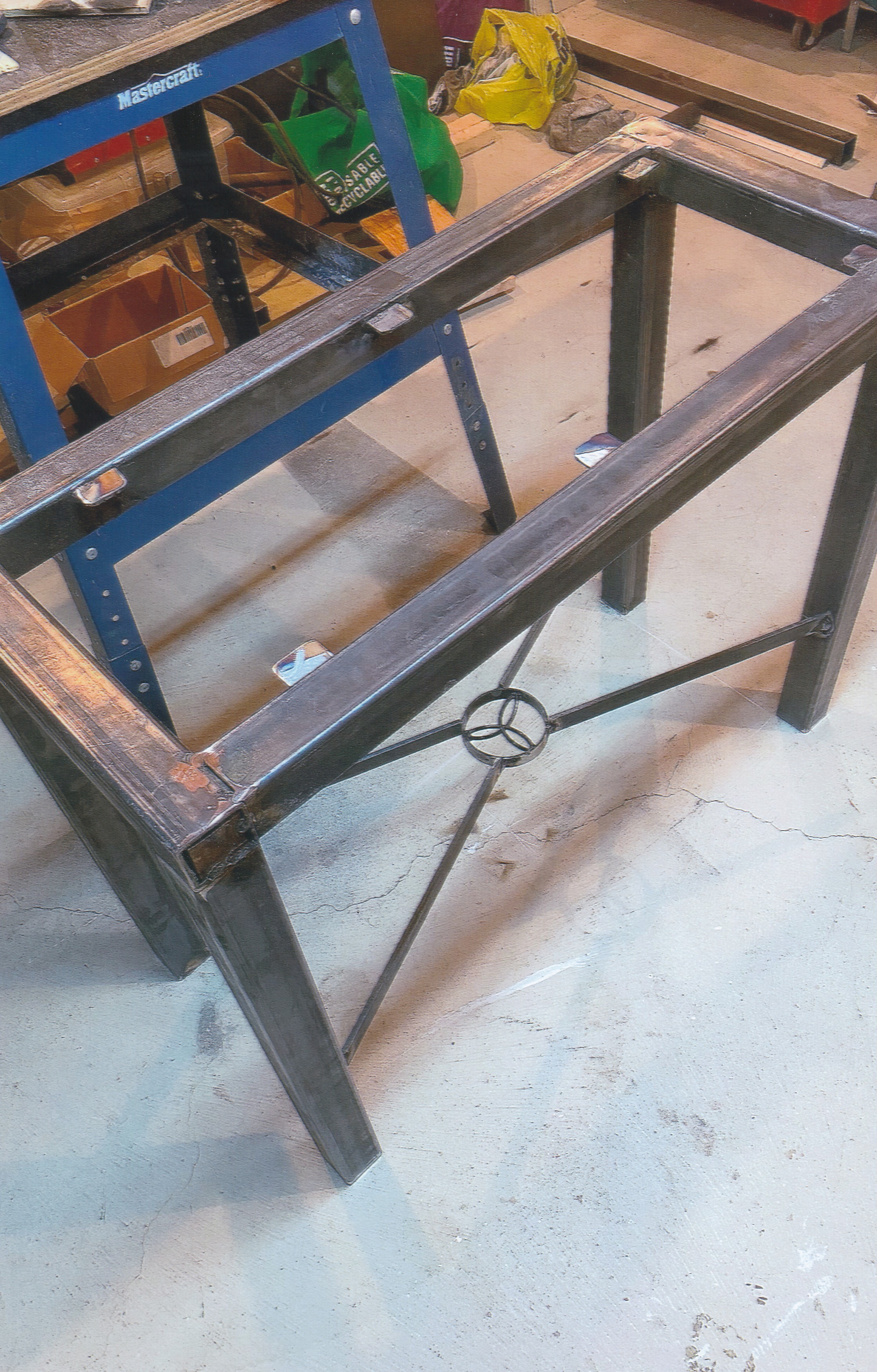The table frame was built from square metal tubing and incorporates hand-crafted Celtic patterns. It is ready for glass inserts and final painting, allowing the client to complete the table’s final aesthetic.